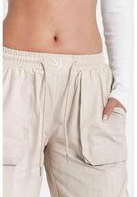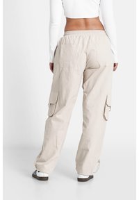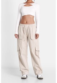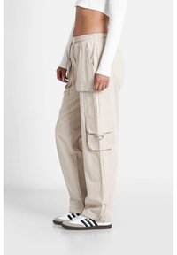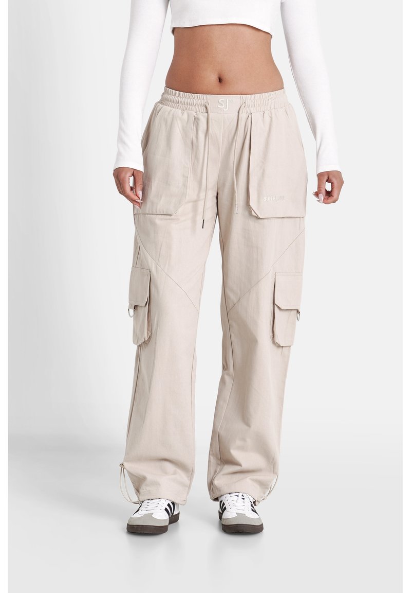 Pantalon cargo beige en tissu léger, avec plusieurs poches, une taille à cordon de serrage et une coupe ample, associé à des baskets blanches.