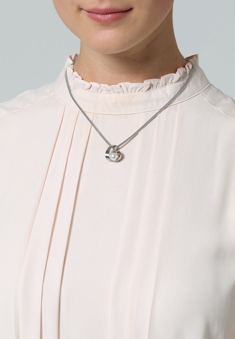 Femme portant un chemisier blanc à col montant avec des plis et un collier argenté orné d'un pendentif rond avec une perle centrale.