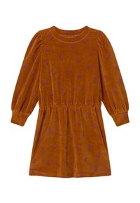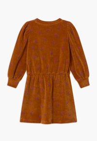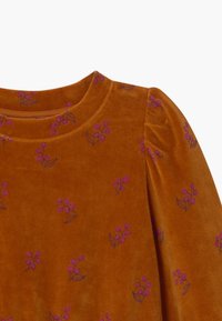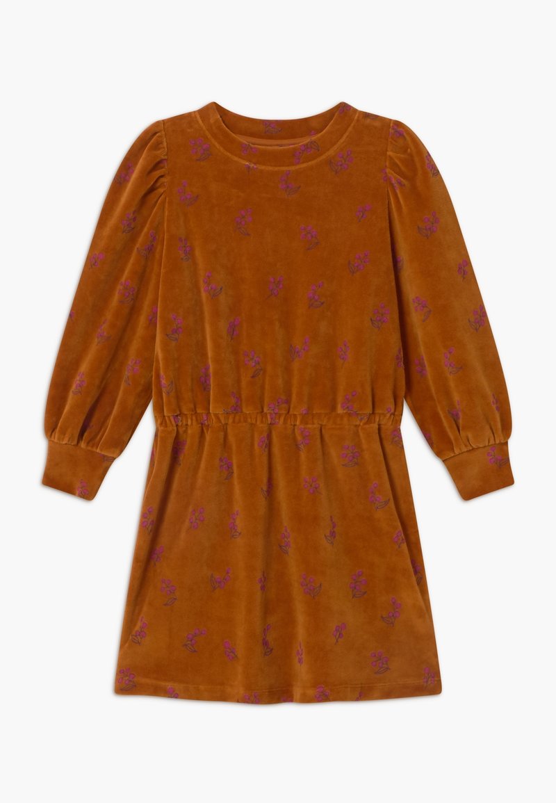 Robe en velours orange brûlé avec motif floral violet, manches longues bouffantes, encolure ronde et taille élastique. Texture douce.