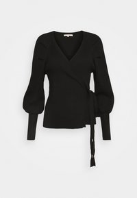 Haut cache-cœur en maille côtelée noire avec manches bouffantes et manches longues moulantes. Doté d'un col en V et d'un détail noué à la taille.