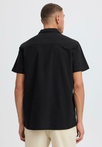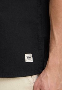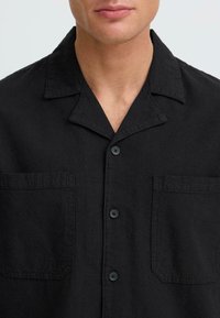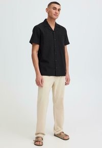 Jeune homme portant une chemise noire à manches courtes à boutons avec deux poches sur la poitrine et un pantalon beige, debout avec une main dans la poche.