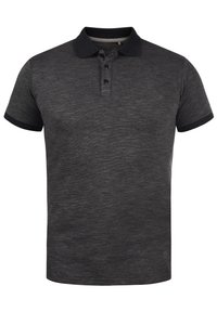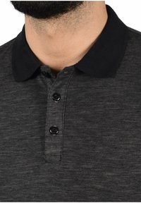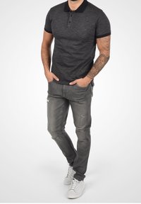 Polo gris avec col noir, associé à un jean gris déchiré et des baskets blanches, mettant en avant un style décontracté et ajusté.
