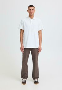 Jeune homme aux cheveux courts portant un polo blanc à manches courtes et un pantalon marron, debout devant un fond clair uni.