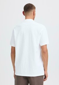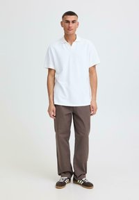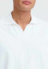 Jeune homme aux cheveux courts portant un polo blanc uni à manches courtes et un pantalon foncé, debout devant un fond clair.