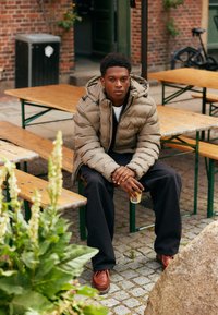 Veste matelassée beige avec capuche, dotée d'une fermeture éclair à l'avant, de cordons de serrage élastiques et d'une texture matelassée. Portée sur un pantalon en denim gris.