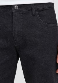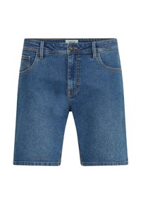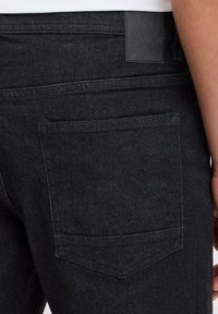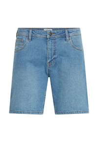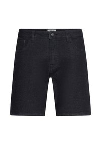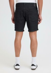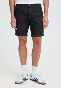 Homme portant un short en jean noir, des chaussettes blanches montantes et des baskets blanches avec des rayures noires, debout devant un fond clair uni.