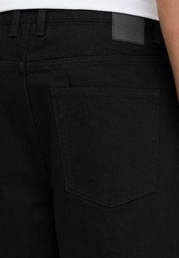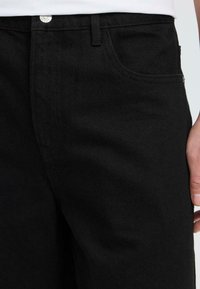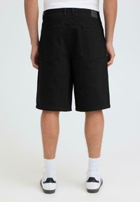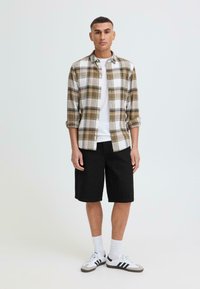 Homme portant un short noir arrivant au genou, des chaussettes blanches et des baskets blanches à rayures noires, debout devant un fond uni.