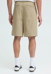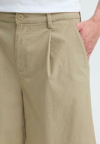 Homme portant un short plissé beige jusqu'aux genoux, des chaussettes blanches montantes et des baskets blanches à bandes noires sur un fond uni.