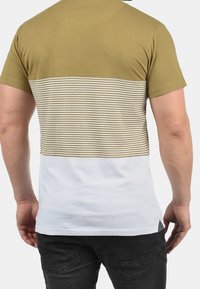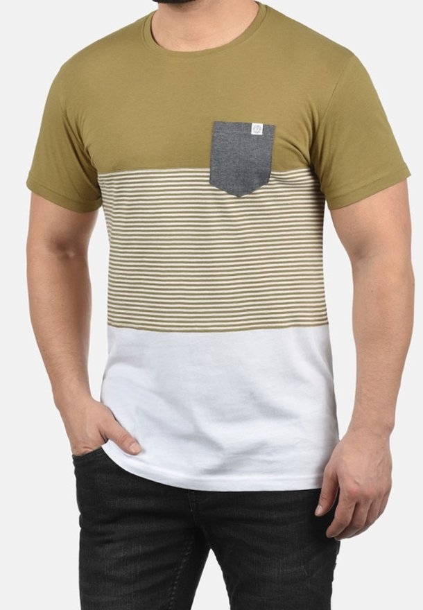T-shirt à manches courtes vert olive et blanc avec un motif rayé, comportant une poche au look denim sur la partie gauche de la poitrine.