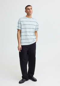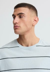 Jeune homme debout, main gauche dans la poche, portant un t-shirt bleu clair avec de fines rayures horizontales noires et un pantalon noir, sur un fond uni.