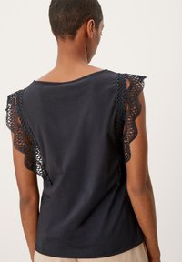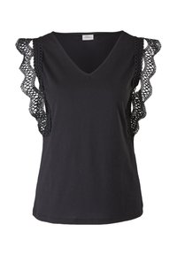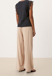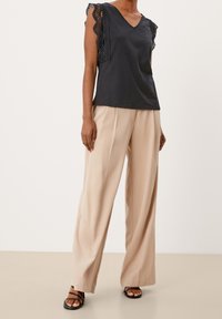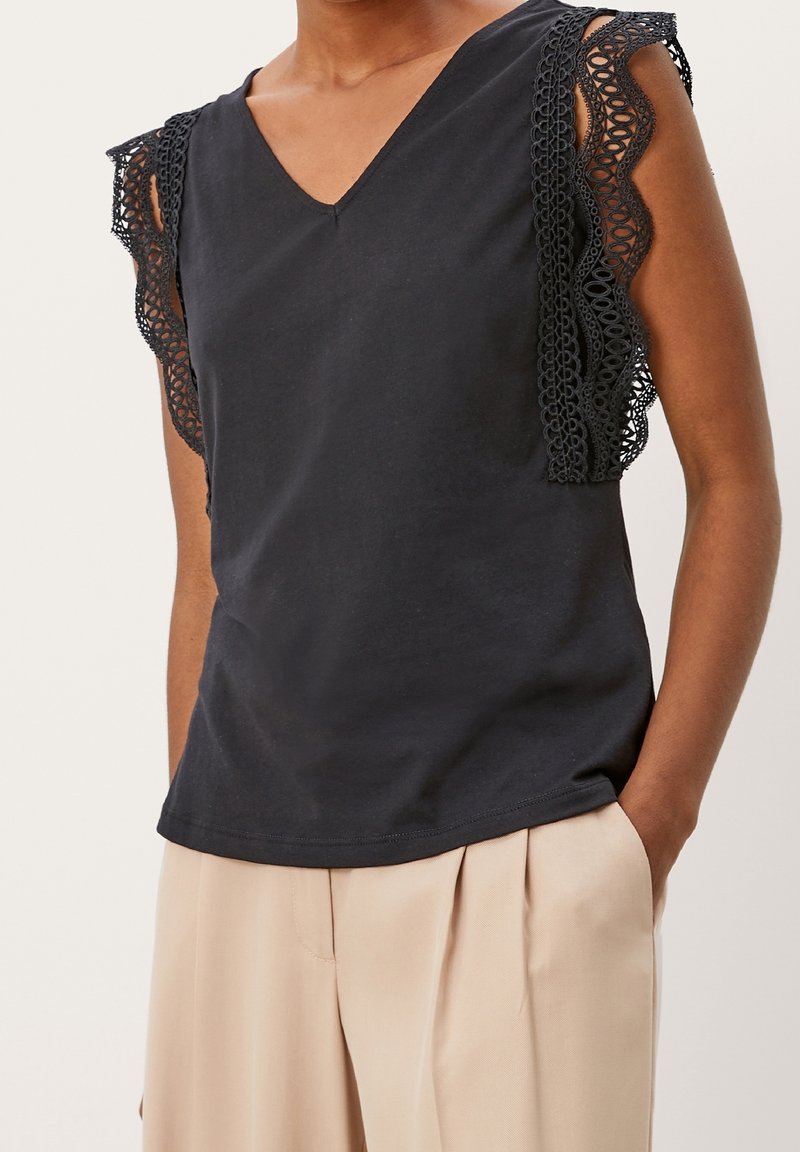 Haut en coton noir avec un décolleté en V, des accents en dentelle sur les épaules et une coupe décontractée, associé à un pantalon beige clair.