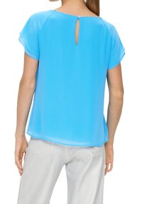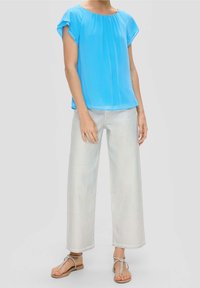 Blouse bleu clair à manches courtes avec décolleté rond, en tissu doux, détail plissé à l'avant et coupe décontractée. Associée à un pantalon argenté brillant.