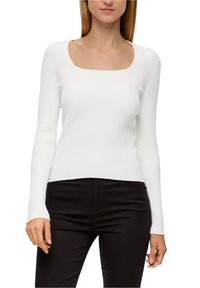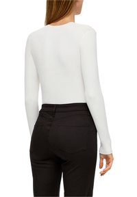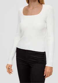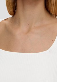 Haut blanc à manches longues côtelé avec encolure carrée et coupe ajustée, accompagné d'un pantalon noir. Texture lisse, détails minimalistes.