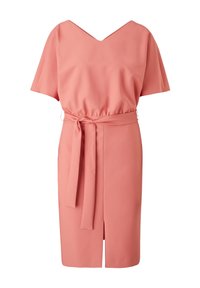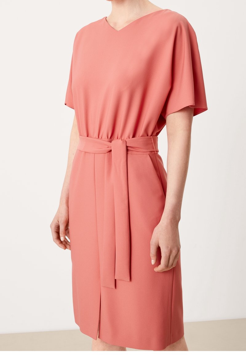 Robe rose corail fabriquée en matière lisse, présentant un col en V, des manches courtes, une ceinture à la taille et une fente à l'avant pour faciliter les mouvements.