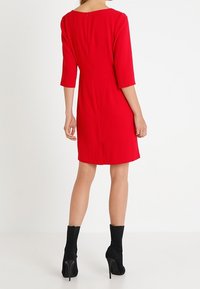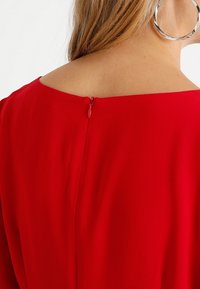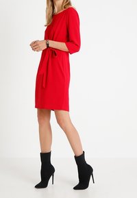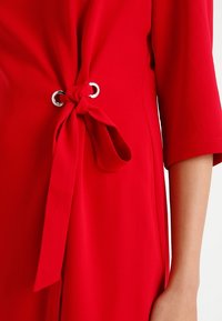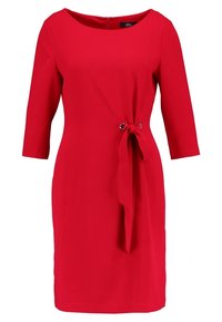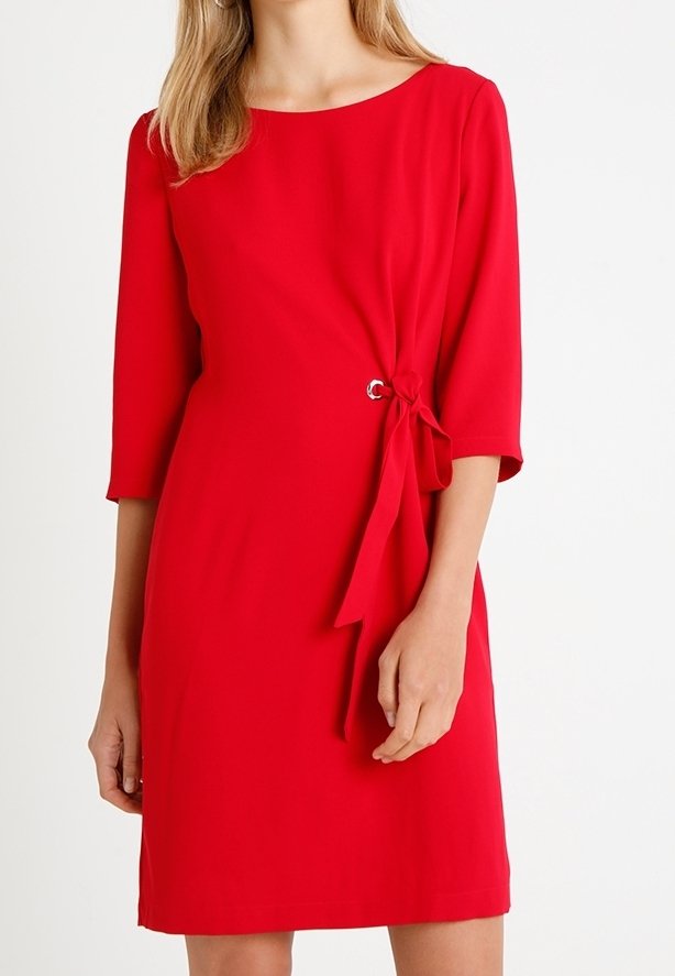 Robe rouge jusqu'aux genoux avec manches trois-quarts, dotée d'un lien sur le côté et d'un accent circulaire. Tissu lisse avec une silhouette ajustée.
