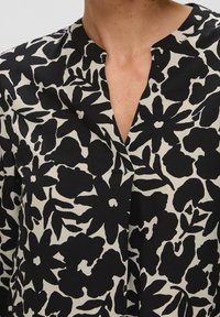 Blouse à manches longues noire et beige à motif floral, avec un col rond et un petit détail en forme de V, portée avec un pantalon noir.