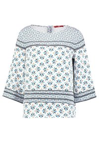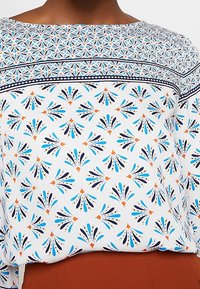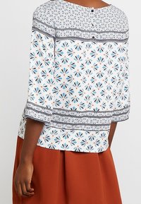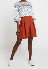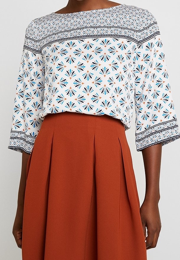 Blouse blanche avec motifs géométriques colorés et bordure noire, associée à une jupe plissée couleur rouille. Les deux vêtements ont une coupe décontractée.
