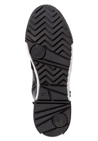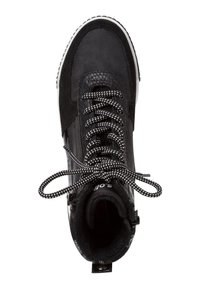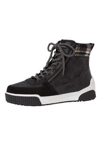 Bottes montantes noires en mélange de daim et cuir verni. Elles présentent un col en tissu écossais, des accents texturés et une semelle en caoutchouc. Lacets noirs.