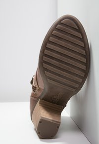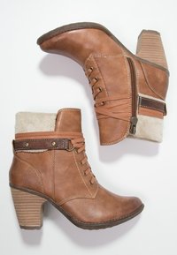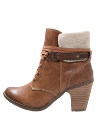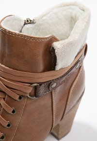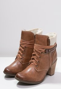 Bottine en cuir marron avec un col en matière pelucheuse, fermeture à lacets sur le devant, et une semelle à talon empilé avec des rainures horizontales.