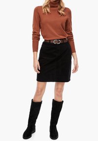 Femme portant un col roulé couleur rouille, une jupe noire ceinturée et des bottes noires montant jusqu'aux genoux, debout devant un fond blanc uni.