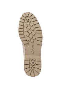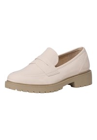 Mocassin en cuir verni beige avec un bout arrondi, design à enfiler, et épaisse semelle en caoutchouc beige présentant un motif de traction texturé.