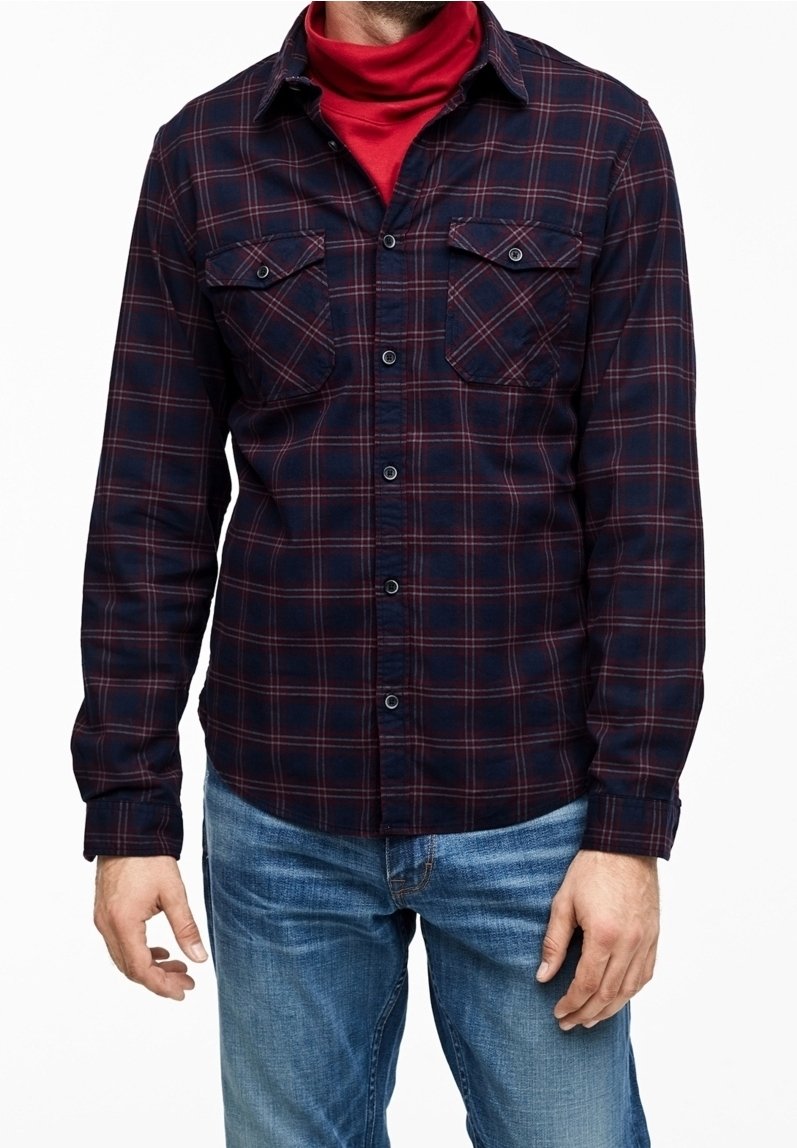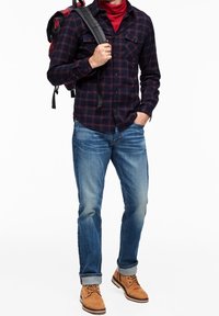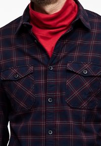 Homme portant une chemise à carreaux bleu et rouge à boutons sur un col roulé rouge, associé à un jean bleu, debout devant un fond blanc.