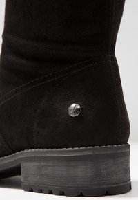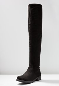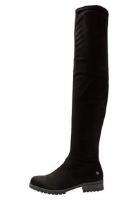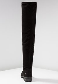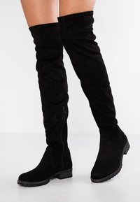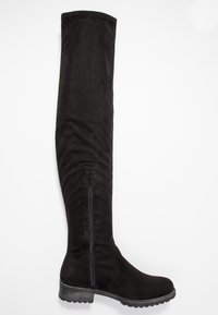 Bottes cuissardes noires en suède souple avec une fermeture éclair latérale et une semelle en caoutchouc texturée. Elles présentent un bout arrondi et un talon épais.