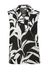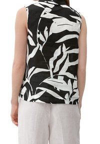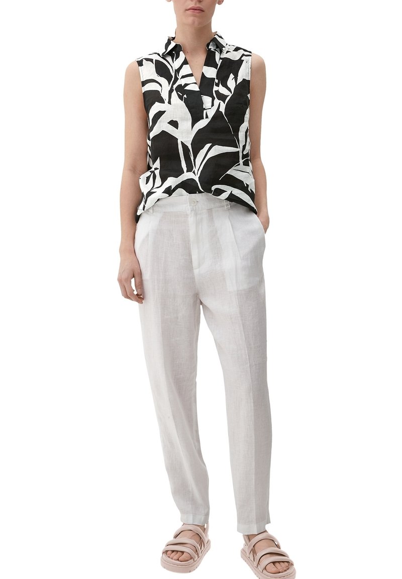 Haut sans manches à motifs noir et blanc, pantalon en lin gris clair et sandales pâles. Le haut présente un col et une coupe décontractée.
