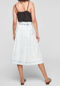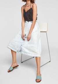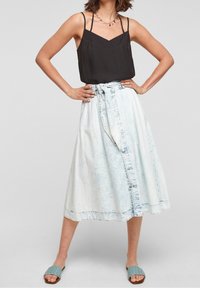Camisole noire à fines bretelles et col en V, associée à une jupe en denim bleu clair taille haute avec ceinture nouée et fermeture à boutons.