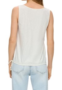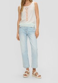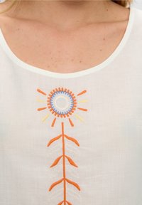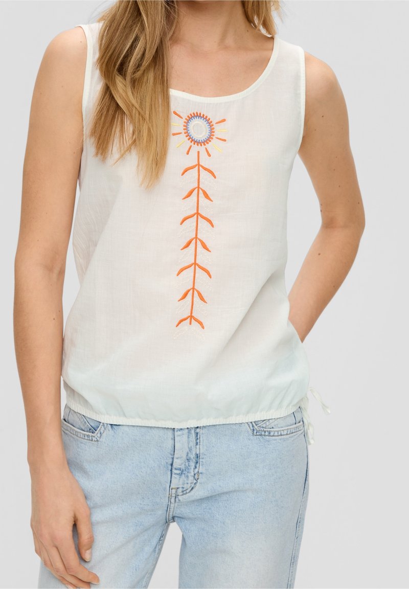 Haut blanc sans manches avec broderie florale orange et motif de feuilles. Dispose d'un col rond et d'un ourlet à cordon de serrage pour un ajustement réglable.