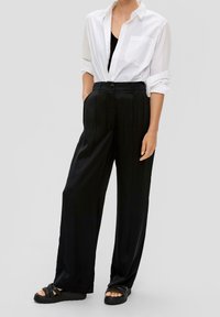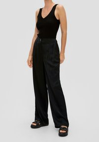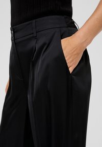 Pantalon plissé noir en tissu léger avec une coupe ajustée, doté d'une fermeture à bouton et de poches latérales. Devant plat, coupe jambes larges.