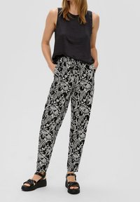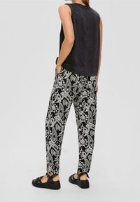 Pantalon à motifs noir et blanc avec taille à cordon, porté avec des sandales à plateforme noires et un haut noir sans manches.