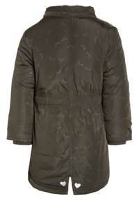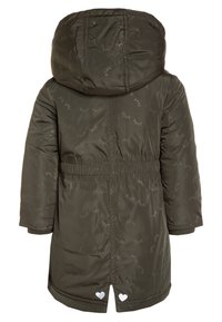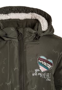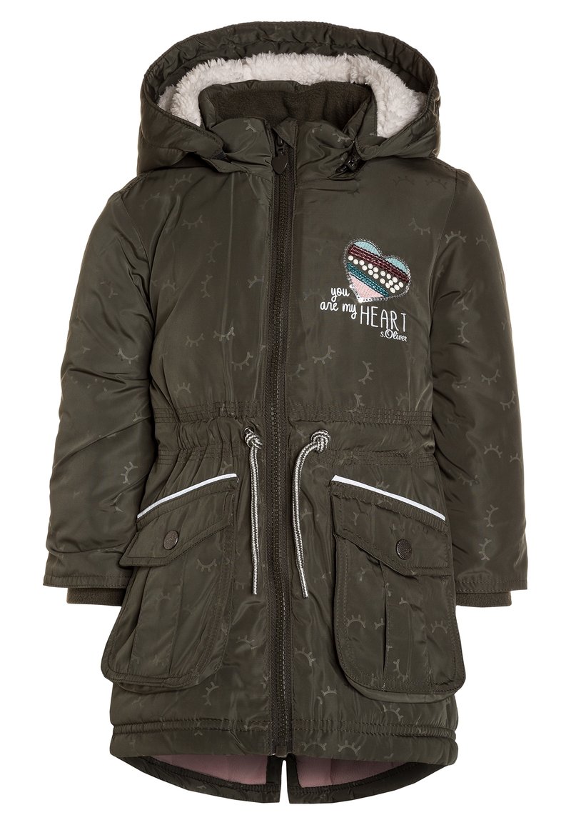 Manteau d'hiver à capuche pour enfants, vert foncé, avec fermeture éclair frontale, cordons de taille réglables, deux poches à rabat et broderie en forme de cœur portant l'inscription « Tu es mon cœur ».