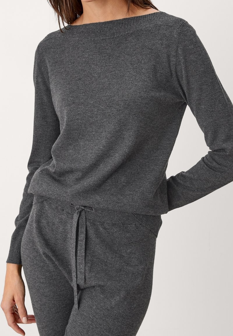 Pull gris tricoté avec encolure bateau, manches longues et poignets côtelés. Associé à un pantalon à cordon assorti avec une finition texturée.