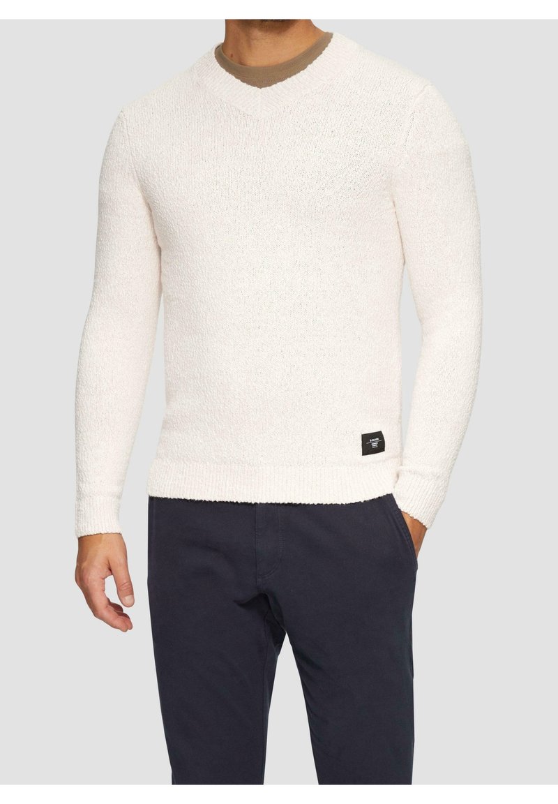 Pull en maille blanche texturée avec un col en V, des manches longues, et un bas ourlé. Présente une petite étiquette rectangulaire sur le côté inférieur.