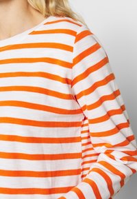 Chemise à manches longues rayée blanc avec des rayures orange, dotée d'un col rond et de poignets blancs, associée à un jean en denim bleu foncé.