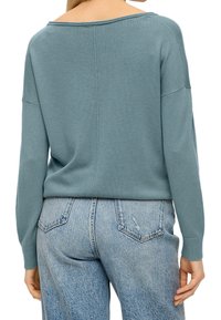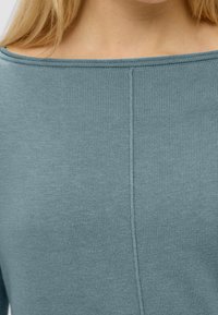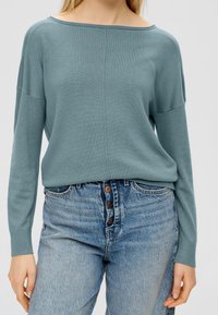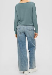 Pull ample bleu clair à encolure bateau, texture côtelée et manches longues, associé à un jean en denim délavé taille haute avec fermeture à boutons.