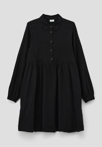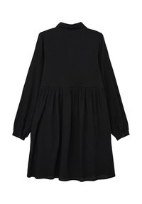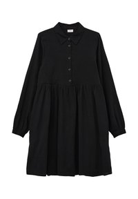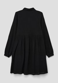 Robe noire boutonnée en tissu texturé. Comprend un col, des manches longues et une taille froncée pour une silhouette fluide.