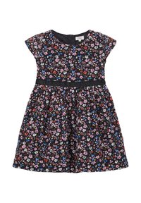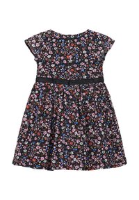 Robe fleurie noire à manches courtes, ornée de fleurs multicolores et d'une taille cintrée. Tissu léger, jupe froncée et fermeture au dos.