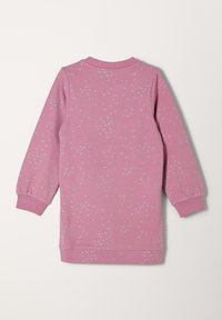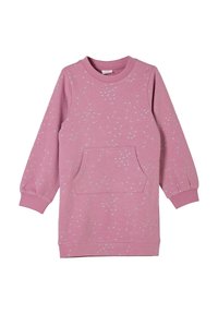 Robe pour enfants à manches longues, rose, ornée de paillettes argentées en forme d'étoiles et d'une poche kangourou à l'avant, avec des poignets et un col côtelés.