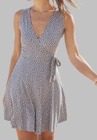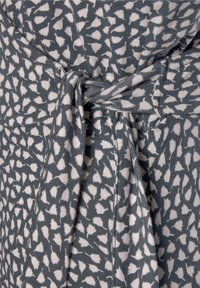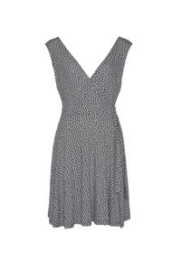 Robe bleu marine avec un décolleté en V, sans manches, présentant un motif abstrait blanc et un détail à nouer à la taille. Fabriquée en tissu léger.