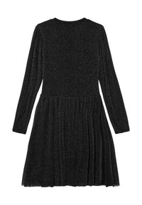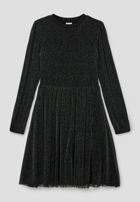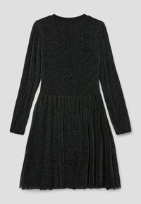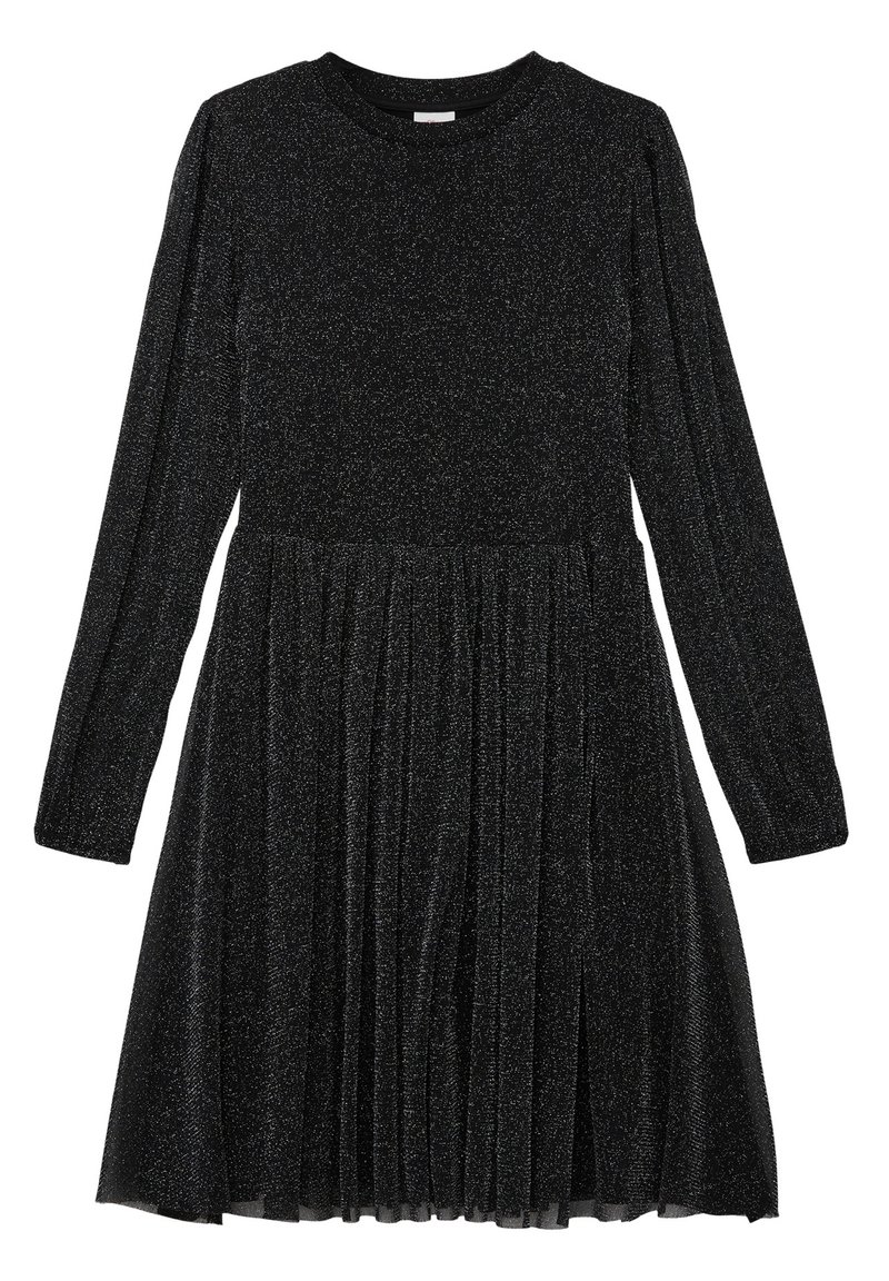 Robe noire à manches longues avec une jupe évasée, fabriquée en tissu texturé avec un subtil éclat, et un col rond.