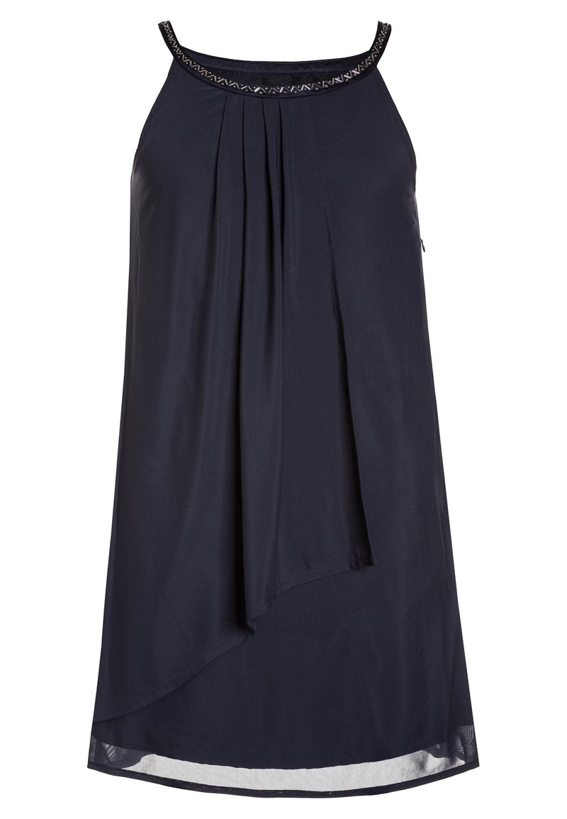 Robe bleu marine sans manches avec un devant plissé, un ourlet asymétrique et une bordure décorative le long de l'encolure ronde.