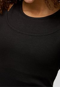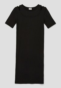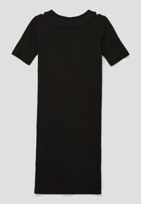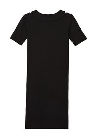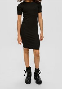 Fille portant une robe noire côtelée à manches courtes et longueur genou et des bottes de combat noires à lacets, debout sur un fond uni.