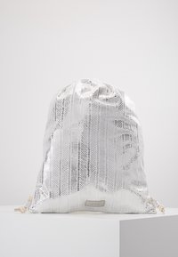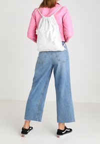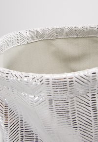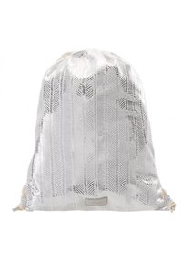 Sac en filet blanc à cordon de serrage avec des rayures texturées verticales et des cordons en corde beige, reposant sur un piédestal blanc contre un arrière-plan uni.