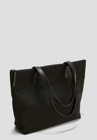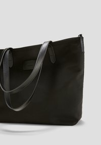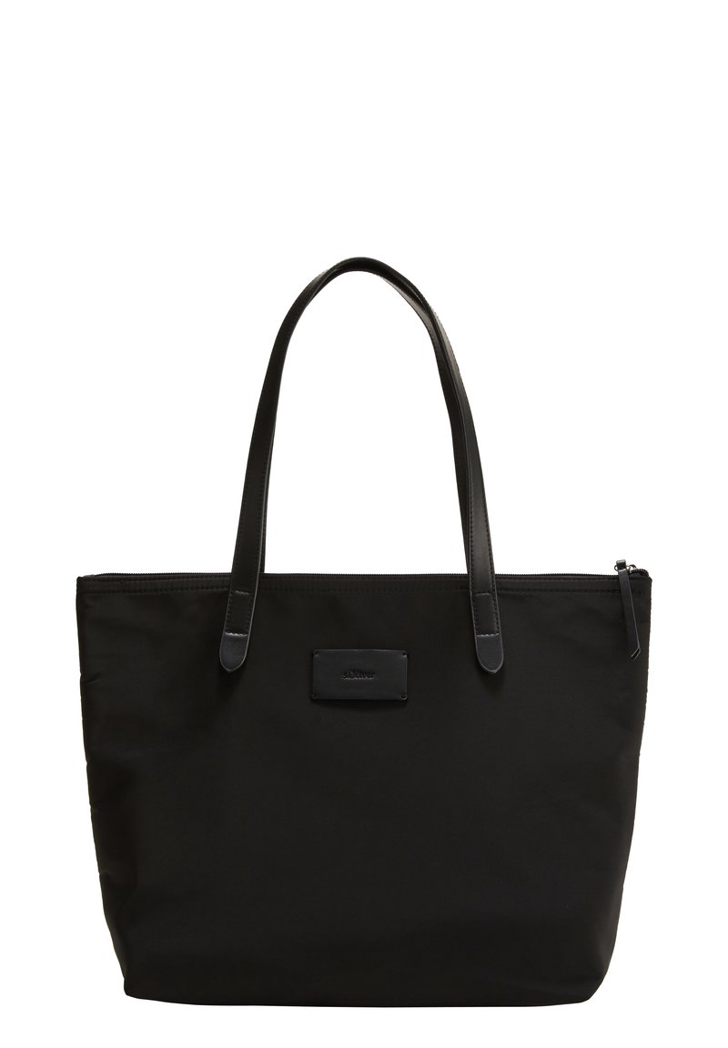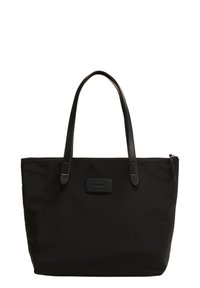 Sac fourre-tout en nylon noir avec deux poignées en cuir noir, fermeture éclair sur le dessus et une petite étiquette logo à l'avant. Forme rectangulaire simple.