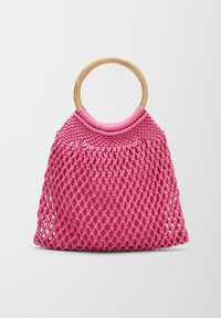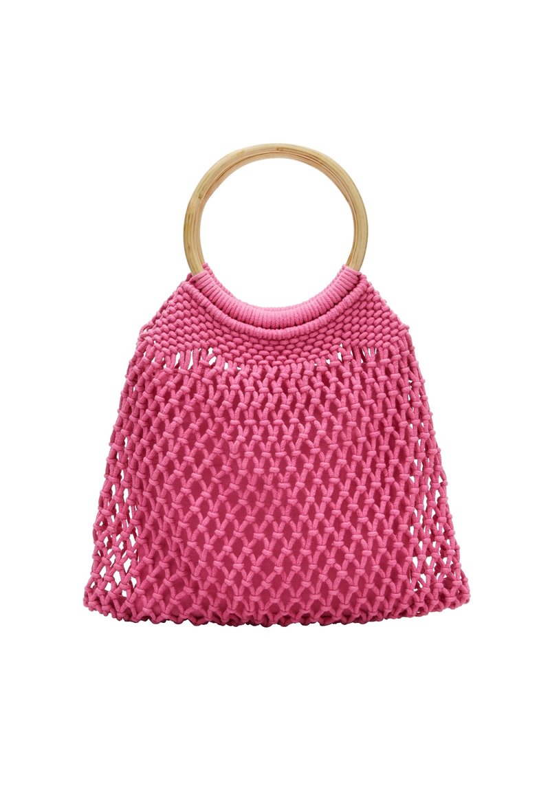 Sac à main tissé rose avec une poignée en bambou, présentant un motif ajouré et une forme arrondie, rehaussé par une bande supérieure lisse.