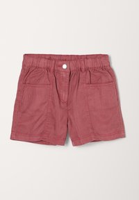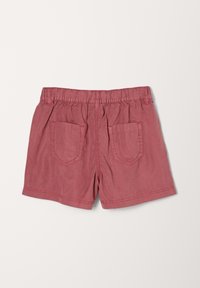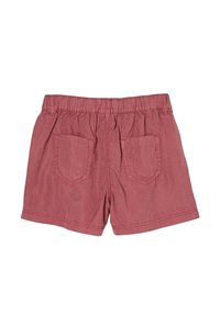 Shorts rouges délavés pour enfants avec taille élastique, fermeture devant à boutons et deux poches plaquées avant, présentés à plat sur un fond blanc.