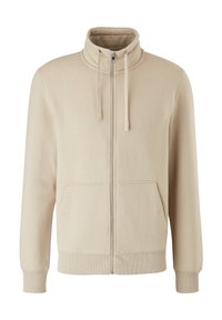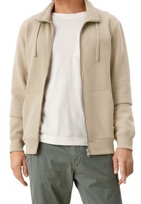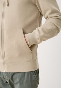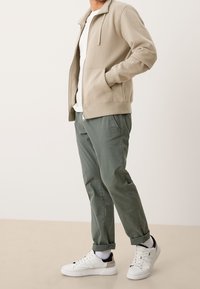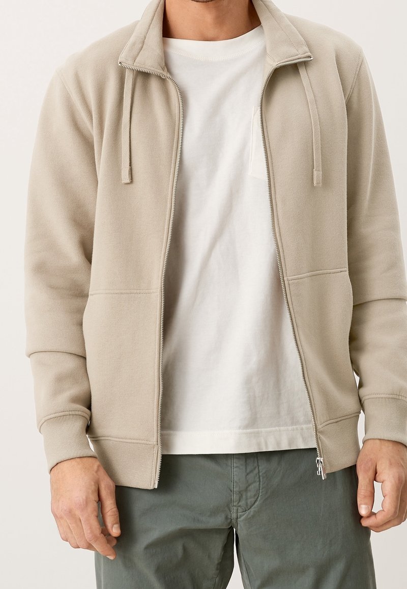 Homme portant un sweat à capuche beige zippé par-dessus un t-shirt blanc et un pantalon gris-vert, debout devant un fond uni.