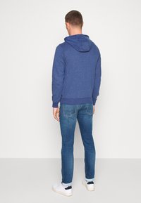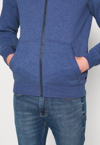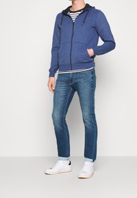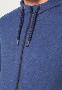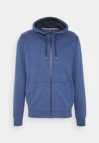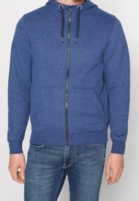 Homme portant un sweat à capuche zippé bleu avec des poches avant et des cordons, associé à un jean bleu, sur un fond uni.